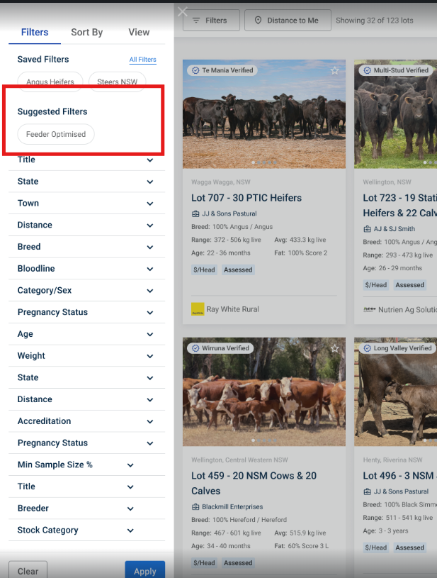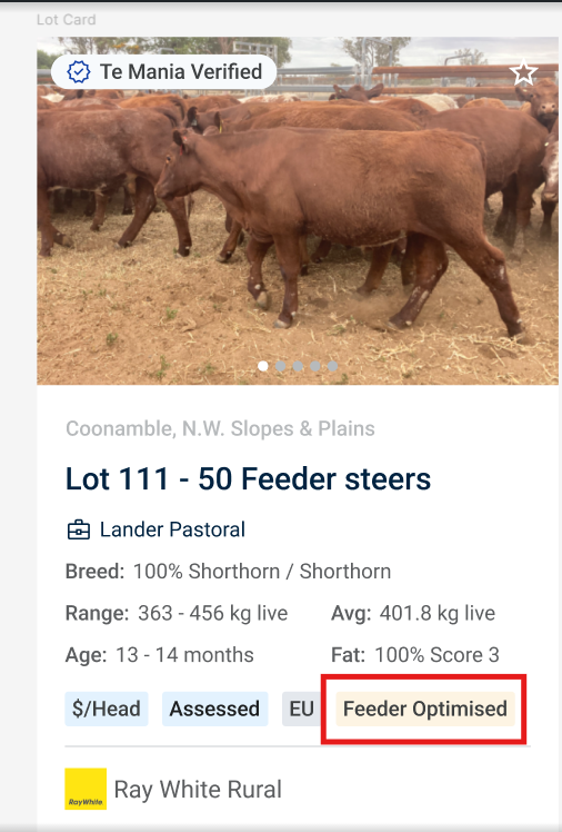 The Feeder Optimised badge is tagged to all cattle listings that align with feedlot buyers' tight specifications. The Feeder Optimised badge is easily visible in catalogue lot views - and can be readily selected as a filter to further focus browsing and bid short-listing.